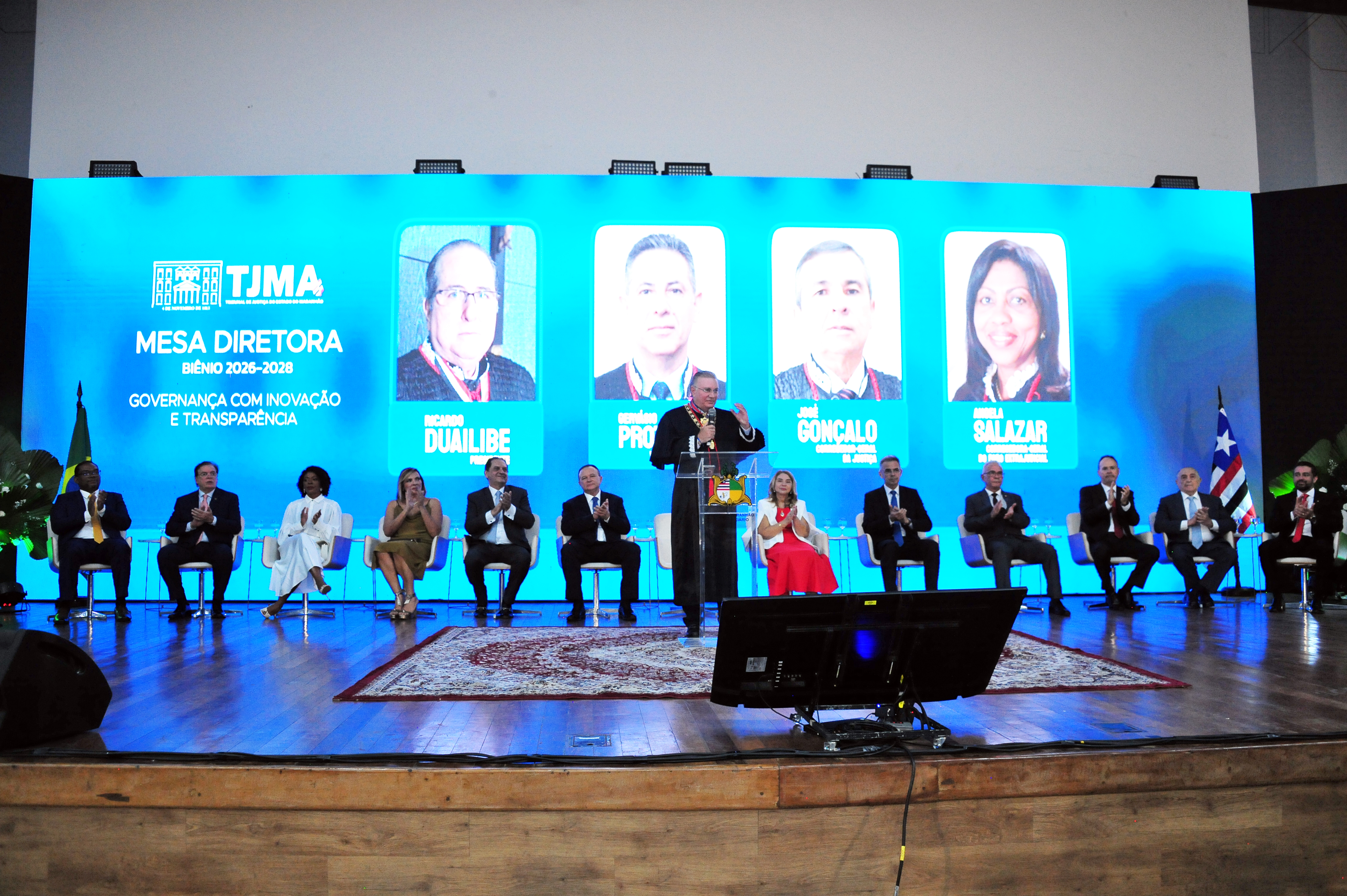 Com foco em uma gestão voltada à inovação e à transparência, a nova Mesa Diretora do Poder Judiciário do Maranhão - composta pelos desembargadores Ricardo Tadeu Bugarin Duailibe (presidente), Gervásio Protásio dos Santos (vice-presidente); José Gonçalo de Sousa Filho (corregedor-geral da Justiça) e desembargadora Angela Maria Morais Salazar (corregedora-geral do Foro Extrajudicial) - foi empossada na noite desta sexta-feira (24/4), em solenidade no Auditório Darcy Ribeiro, no Centro de Convenções Pedro Neiva de Santana (Multicenter Sebrae), em São Luís. Pela manhã, os empossandos participaram de entrevista coletiva perante a imprensa local.